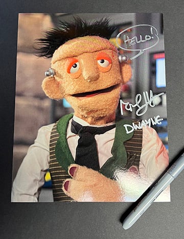 This professional photo is offset printed on 14pt glossy card stock and features Transylvania Television's very own Dwayne Frankenstein. Dwayne is portrayed in the series by co-creator Michael J. Heagle, who also writes and directs the comedy series. SIGNED by DWAYNE / MICHAEL and often foolishly personalized in Dwayne's inimitable style!